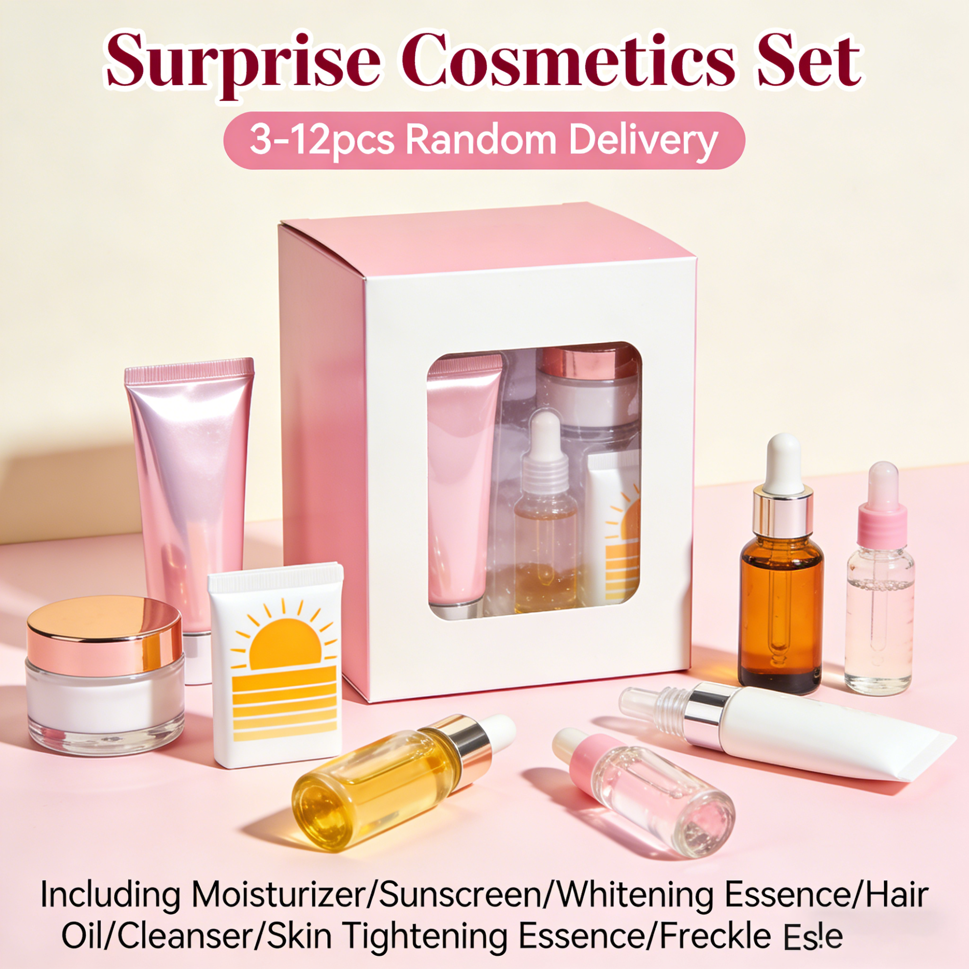 Treasure hunt-themed, random essential products, exciting unboxing journey, diverse beauty options
